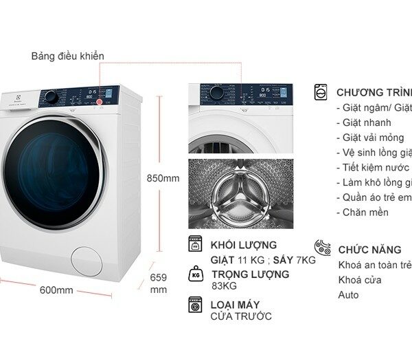 - Máy giặt sấy quần áo có khối lượng giặt 11kg, khối lượng sấy 7kg đáp ứng tốt mọi nhu cầu sử dụng